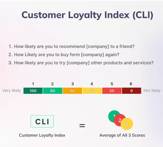 作为NPS的进阶版,CLI既包含了NPS,又超越了NPS。为什么这么说呢?因为它不仅测量了净推荐值,还追踪了客户的复购和交叉购买意愿: