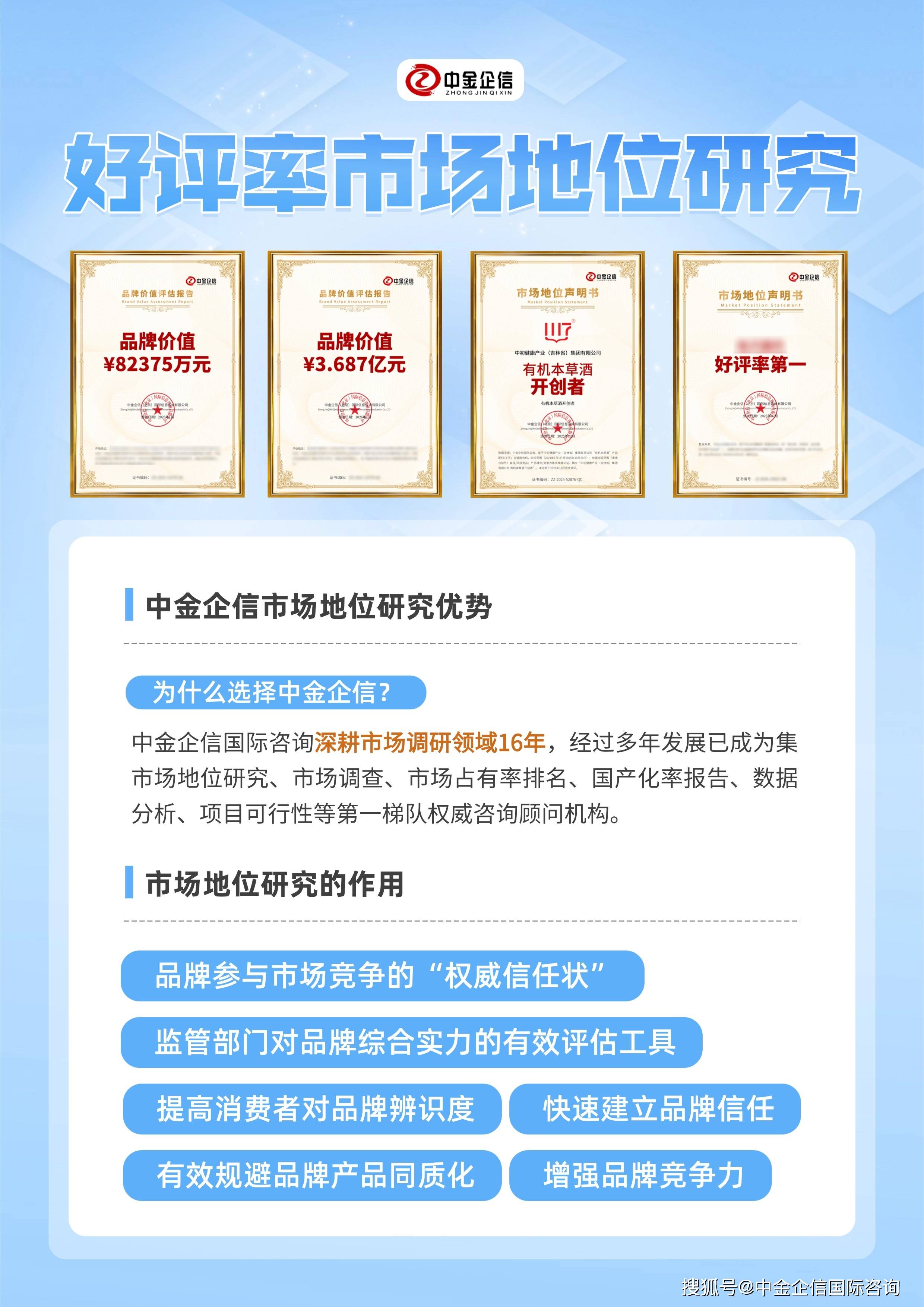 市场地位研究(即:市场地位研究、市场地位确认书),在监管部门、品牌战略、品牌形象、品牌宣传、消费决策、渠道合作等环节对品牌综合实力的信任与监管部门监管评估日益严格的背景下,市场地位研究已成为快速建立品牌信任、降低消费者决策门槛的有效工具;是品牌参与市场竞争的“权威信任状”与重要的“通行证”。