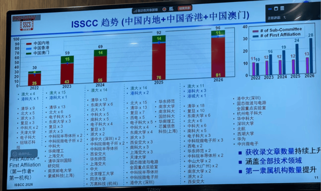 会议核心数据显示,中国(含港澳地区)共有96篇论文被接收,入选总数连续第四年位居全球第一,占总录用数的37.35%(近40%),较上一年度的92篇增加4篇,增幅4.35%,稳中有升的态势凸显中国半导体科研的持续发力。这一成绩不仅远超其他国家和地区,更实现了“量”的积累与“质”的提升,充分展现出中国在半导体高端通用芯片设计、先进制程研发等领域日益强大的科研实力与国际影响力,正式标志着中国芯片设计产业从“跟跑”向“并跑”“领跑”跨越,跻身全球芯片设计第一梯队。从区域分布来看,中国内地贡献81篇论文,澳门大学以11篇位居港澳地区首位,香港地区贡献4篇,形成了全方位、多层次的科研输出格局。