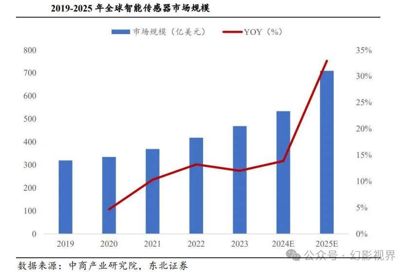 智能传感芯片/传感器市场规模:根据中商产业研究院最新发布的《2024-2029年全球及中国智能传感器市场调查与行业前景预测专题研究报告》数据显示,近年,全球智能传感器市场呈现稳健增长态势,2023年,全球市场规模达到469亿美元,2019-2023年CAGR为10.01%;预计2024、2025年该市场规模将增长至543亿、710亿美元。