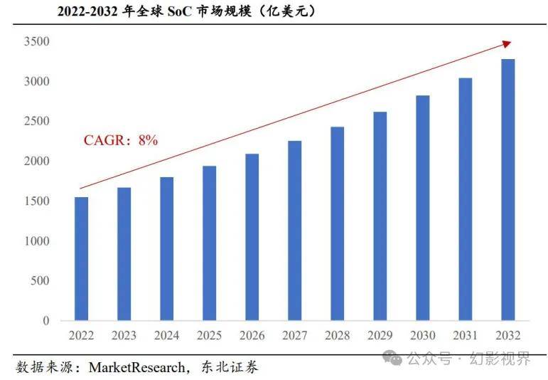 SoC市场规模:根据MarketResearch最新数据,全球SoC市场规模预计将从2022年的1548亿美元增长至2032年的3278亿美元,年复合增长率(CAGR)为8%。市场规模显著增长主要受益于移动设备、物联网等领域对SoC芯片需求持续攀升,这些应用场景通过SoC显著提升了产品性能和能效。同时,随着AI技术普及、5G网络部署加速以及边缘计算发展,SoC技术持续演进以满足日益复杂的处理需求,为各类终端设备提供了更强大的本地化智能计算能力。