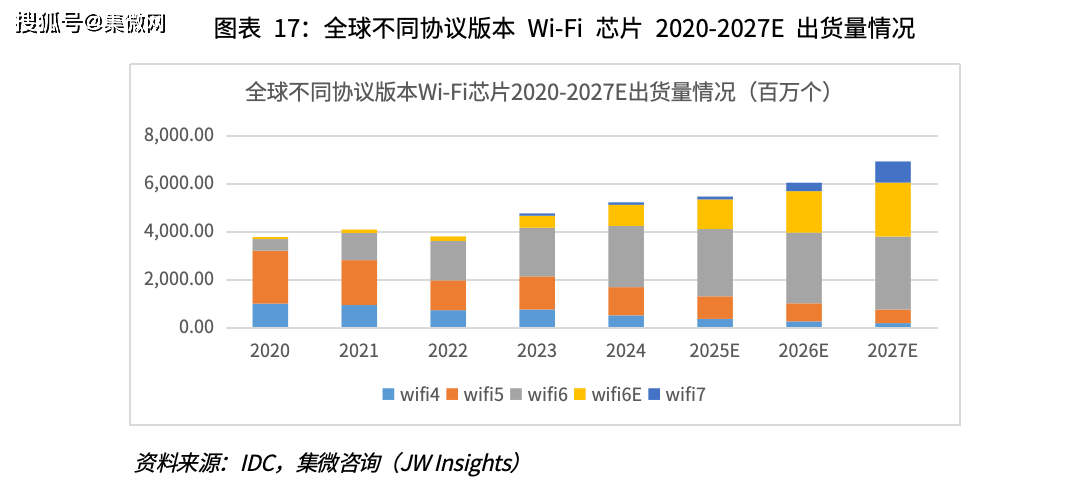 其中值得关注的是,由于 Wi-Fi 5 标准未对 IOT 进行单独定义, Wi-Fi 5 标准下如 需满足 IOT 端场景需求,对吞吐量要求相对较高, Wi-Fi 5 IOT 标准的吞吐量要求相对 较高,而 Wi-Fi 6 标准对 IOT 进行了单独定义,因此市场上物联网 Wi-Fi 芯片产品迭代 顺序通常为 Wi-Fi 4 到 Wi-Fi 6。如博通集成自继物联网 Wi-Fi 4 芯片后推出了全球首款Wi-Fi 6 物联网芯片。