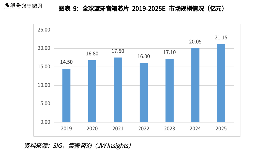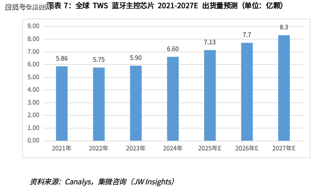 据Gartner数据, 2024年全球蓝牙芯片市场规模约为45.8亿美元,随着蓝牙芯片智能终端需求量的增加及蓝牙芯片价值量的提升,蓝牙芯片整体市场规模预计将继续保持较快增长。集微咨询预测,2025年蓝牙芯片市场规模可达 52.3亿美元,到 2027年达到67 亿美元,三年CAGR 约为14%。