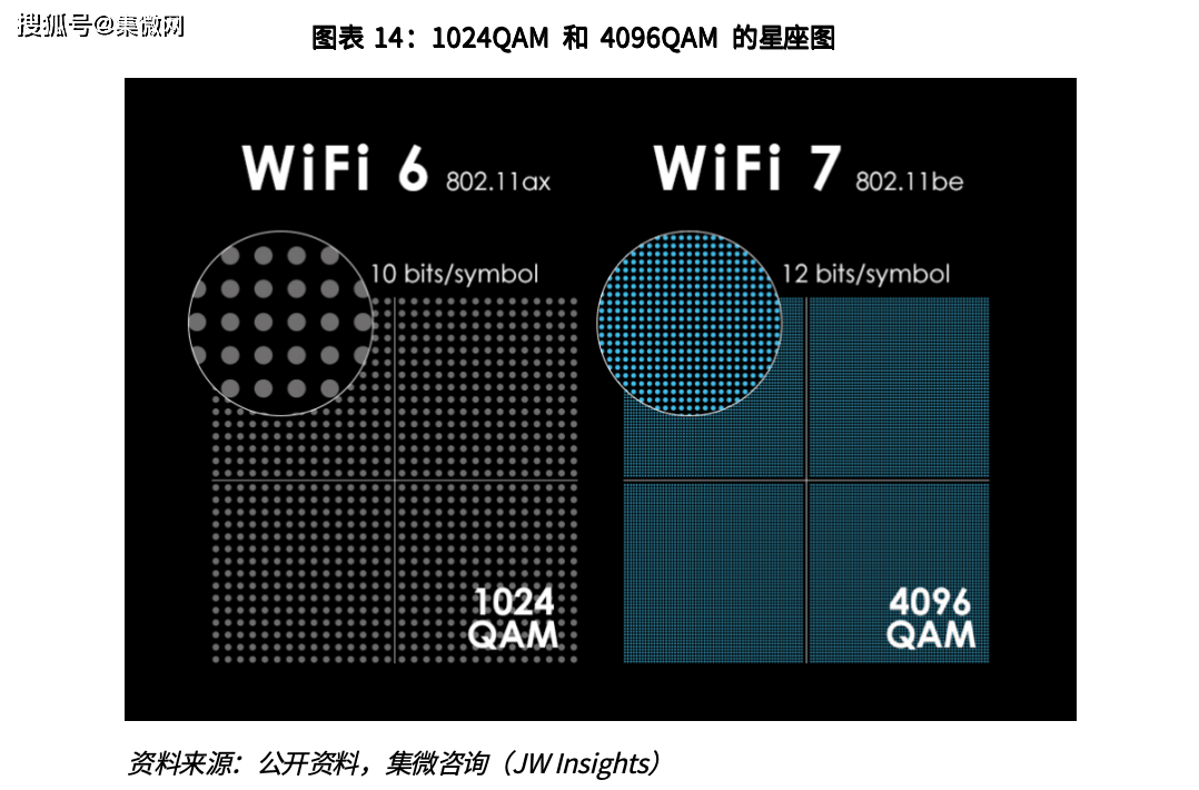 为进一步提升吞吐量,Wi-Fi 6 首次采用 1024QAM 调制方式,Wi-Fi7 支持最高 4096QAM 的调制方式,相同频宽下,更高阶的调制方式可有效提升系统的速率,同 时也使得系统对一些内部/外部的非理想性条件极其敏感。如协议规定 1024QAM 对 EVM 的要求为-35dB,而 4096QAM 对 EVM 的要求达到-38dB,这对系统射频器件的指标及算法设计提出了极大的挑战。