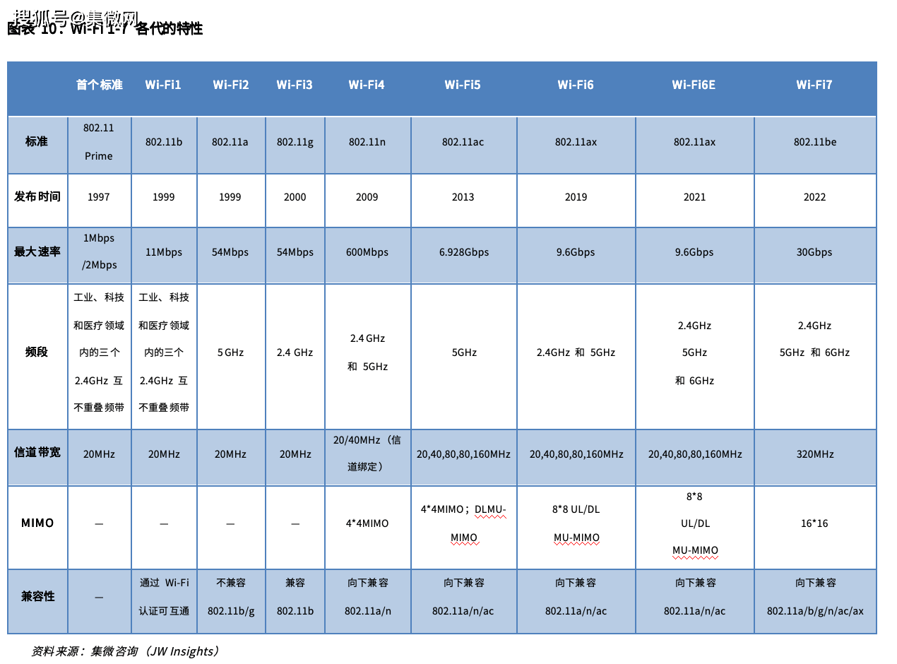如上表所示,Wi-Fi芯片产品的关键指标主要为宽的信号带宽、及多频段同时工作。