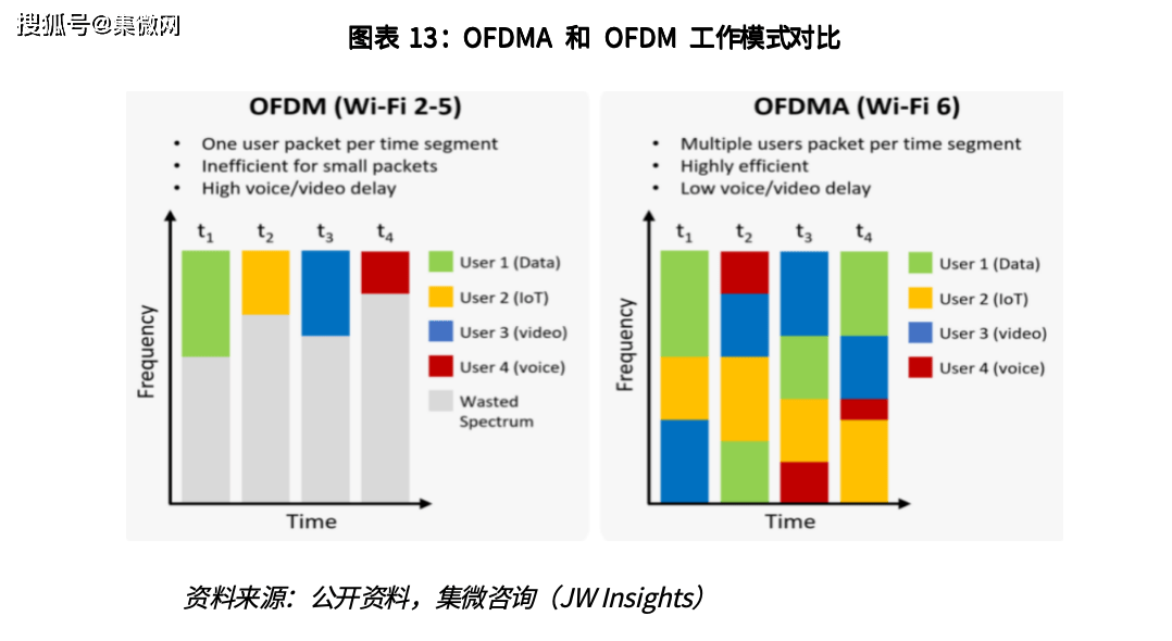 OFDMA在蜂窝系统中使用成熟,但在 Wi-Fi技术中,从 Wi-Fi6才开始应用。OFDMA将频域资源划分为一定颗粒度的子信道(资源单元RU),每个RU传送一个用 户的载荷信息,以提高频谱利用率,降低通信时延,同时在密集部署的场景中还可有效提升网络接入效率。