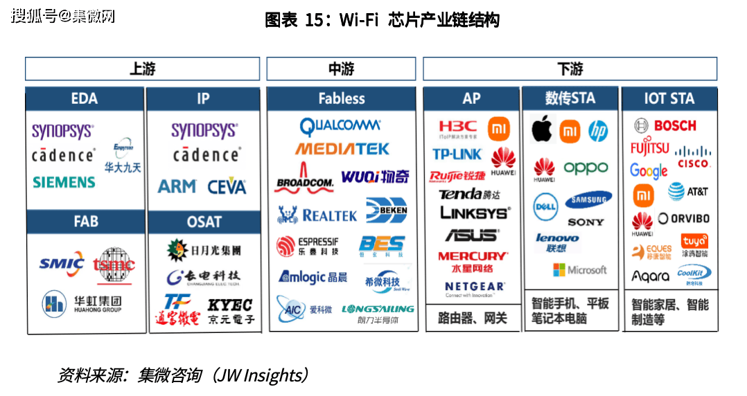 Wi-Fi 芯片整体产业链结构与蓝牙芯片基本一致,芯片设计公司以 Fabless 为主。