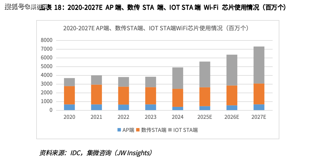 3 、IoT STA 端:即物联网站点端,主要用于智能家居、白电等嵌入式设备,通过 无线网络实现远程控制和数据传输。整体来说,IoT 端的芯片需要支持低成本、低功耗、小尺寸等性能指标。目前市场 IOT STA 设备终端主要使用 Wi-Fi 4 芯片。
