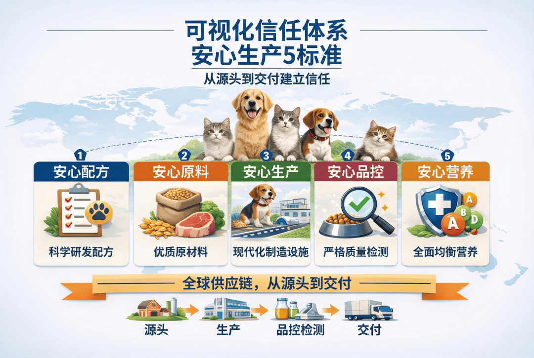 在宠物行业竞争日趋白热化的背景下,「领先」仍能保持高质量增速的背后并非偶然。其根本在于品牌精准洞察到消费者从“尝鲜”到“求稳”的需求转变,并通过“安心五标准”(安心配方、安心原料、安心产线、安心品控、安心营养)将信任可视化、体系化。