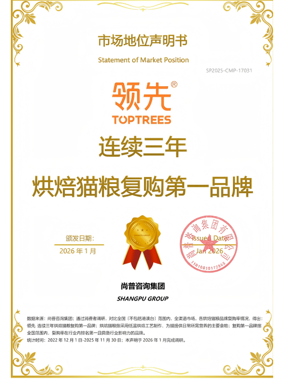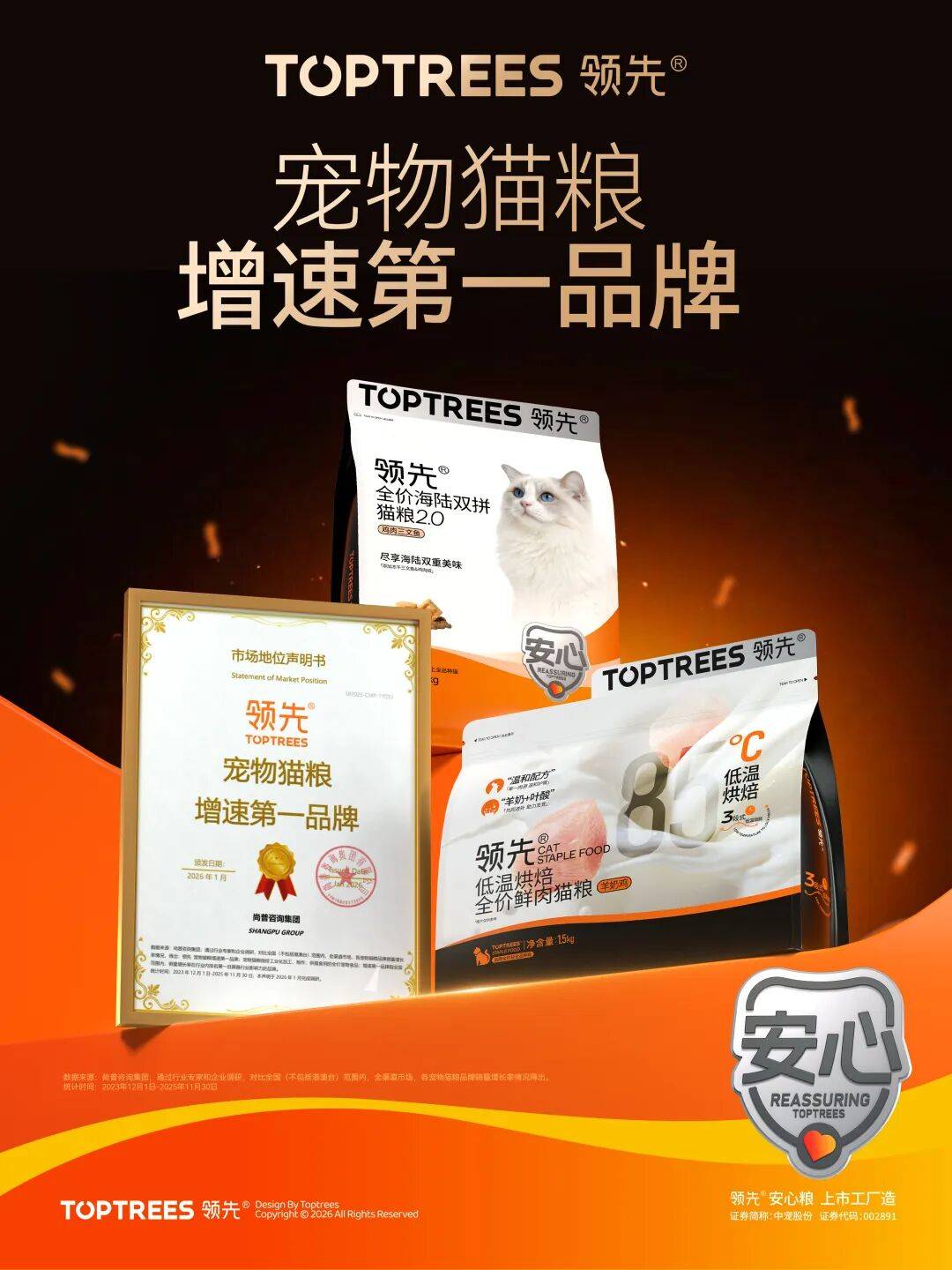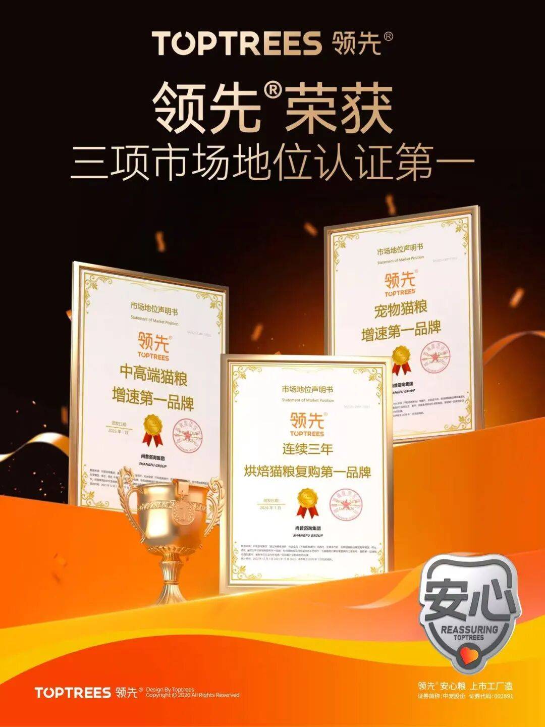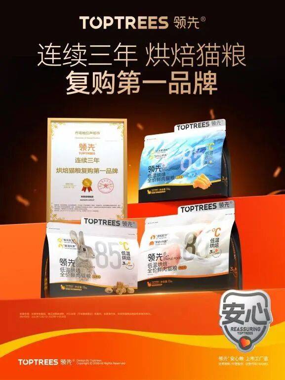 近日,中宠股份旗下核心自主品牌Toptrees 领先® (以下简称「领先」)凭借“中国猫粮市场增速第一”与“连续三年烘焙猫粮复购第一”的双重认证,交出了一份具有行业启示意义的答卷。